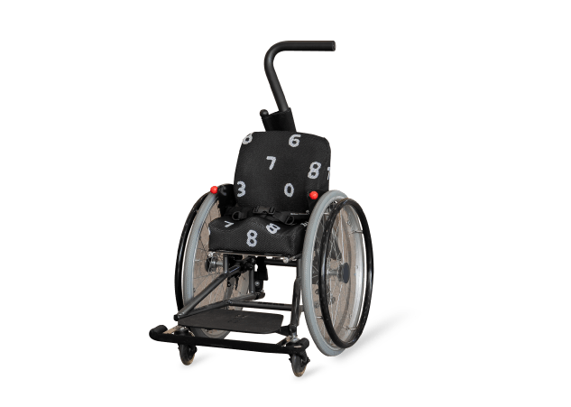 自走用車いすをフレームとして使った座位保持装置。姿勢を整えることで視線が高くなり、安定した走行が可能になります。